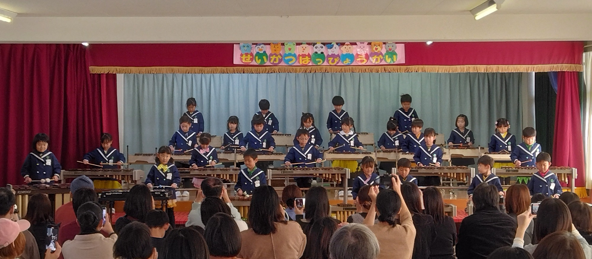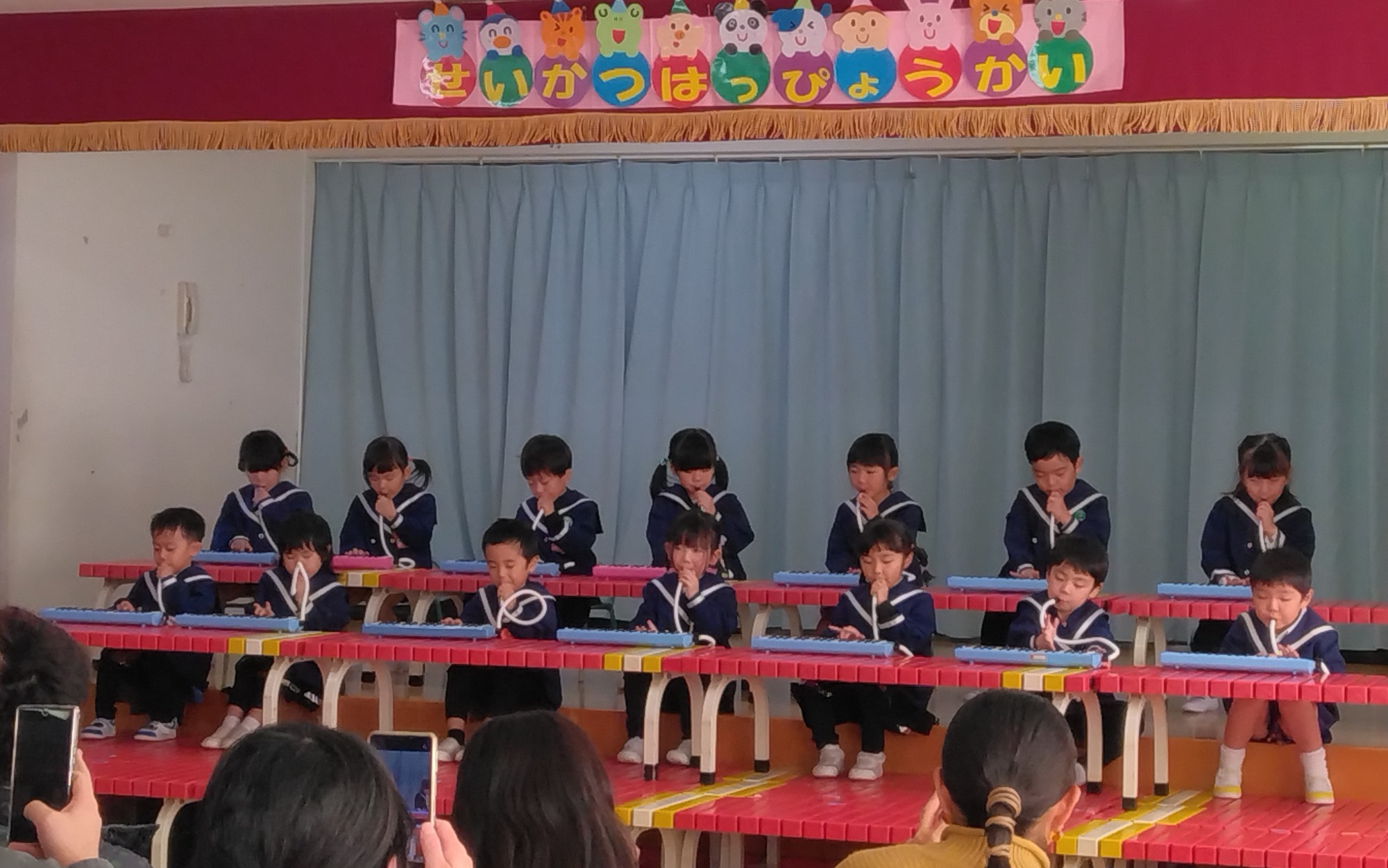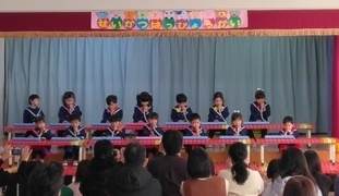 年中組の鍵盤ハーモニカ奏は、ピアノ伴奏のクリスマスの曲に合わせながら『メリーさんのひつじ』や『ぶんぶんぶん』の童謡の曲を演奏するというなかなか難しいことに挑戦!年長組はシロフォンの演奏で『となりのトトロ』の曲をメドレーで演奏しました。