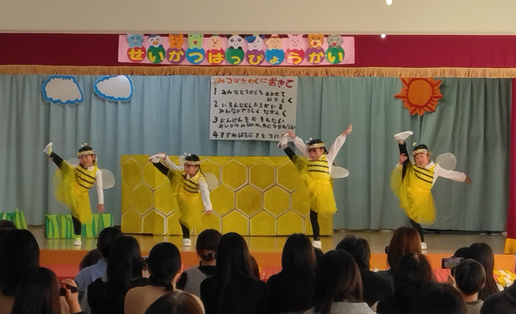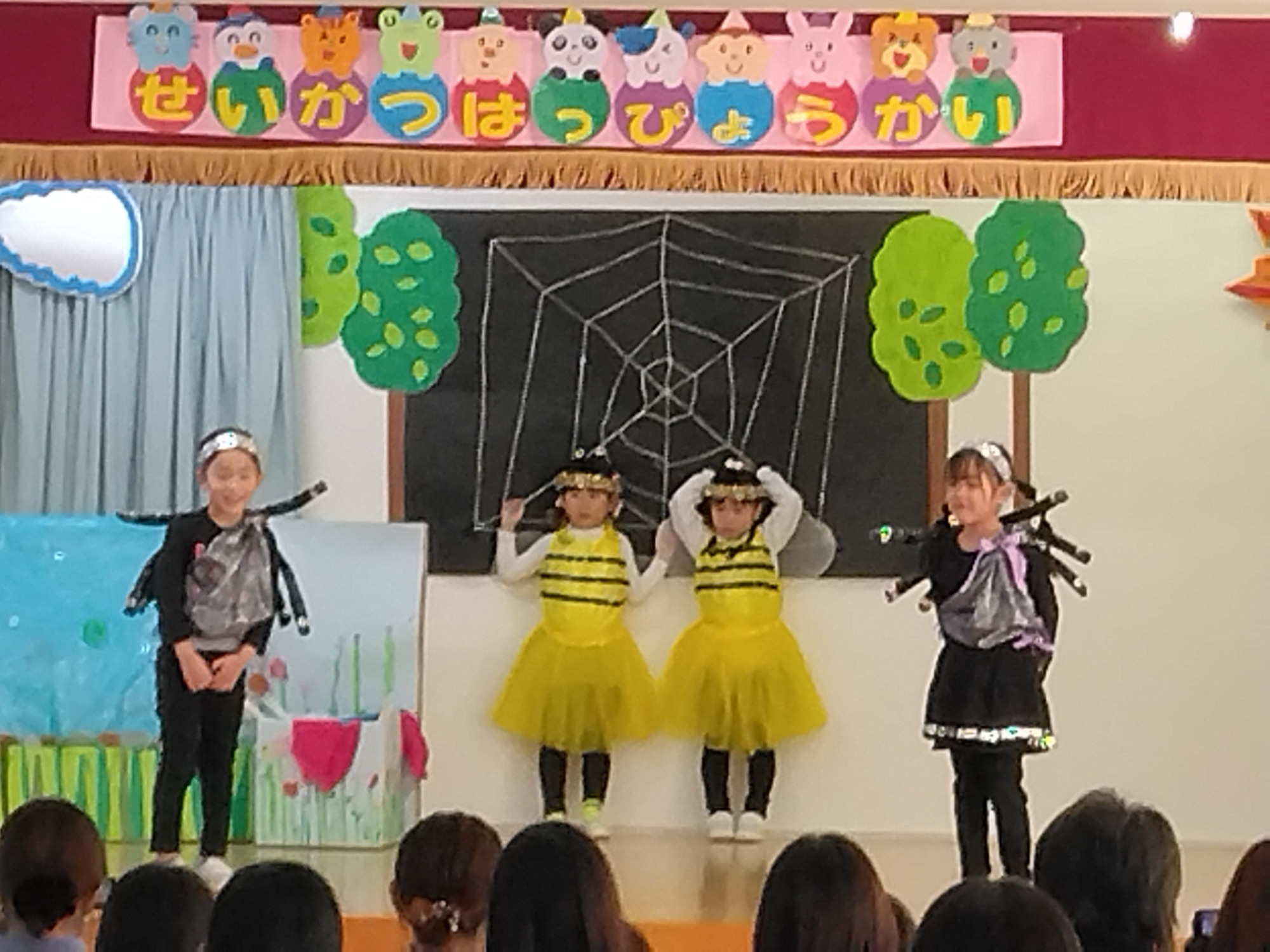 ゆり組は、絵本『みつばちマーヤのぼうけん』の劇遊びをしました。みつばちのマーヤが自由を求めて飛び回るなかで、自然の厳しさやまわりの友達と友情などを学んでいくストーリー。