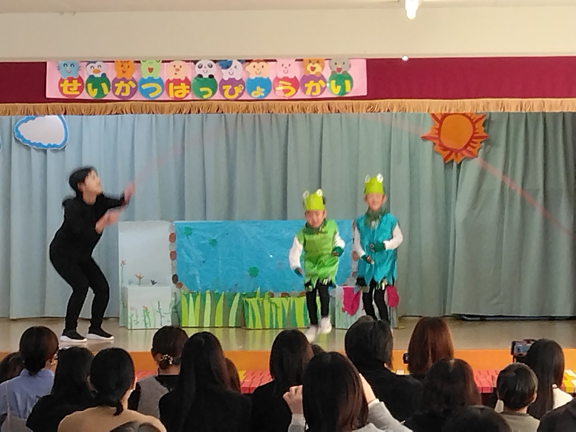 さくら組は、絵本『おたまじゃくしの101ちゃん』の劇遊びをしました。101ぴきのおたまじゃくしとお母さんカエルがお散歩に出かけたものの、101ちゃんが迷子になってしまい、事件に巻き込まれてしまうハラハラドキドキするお話です。