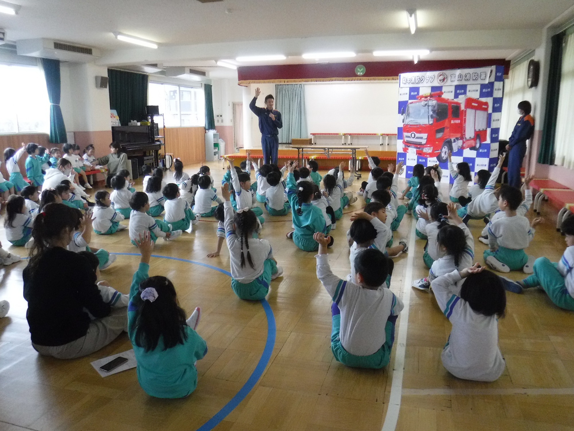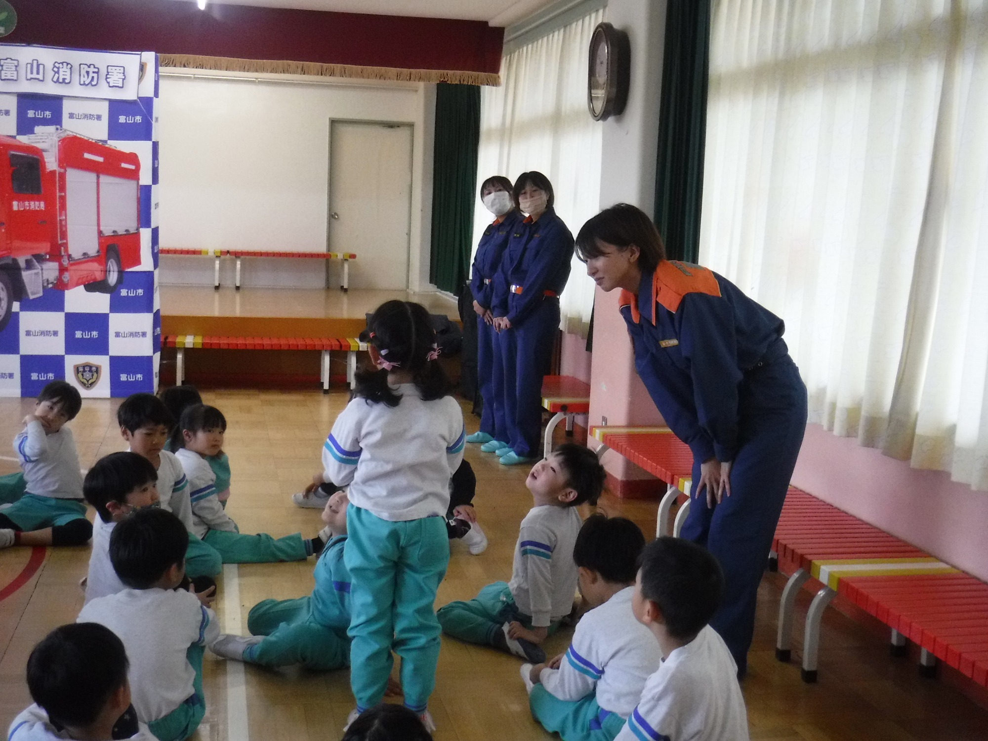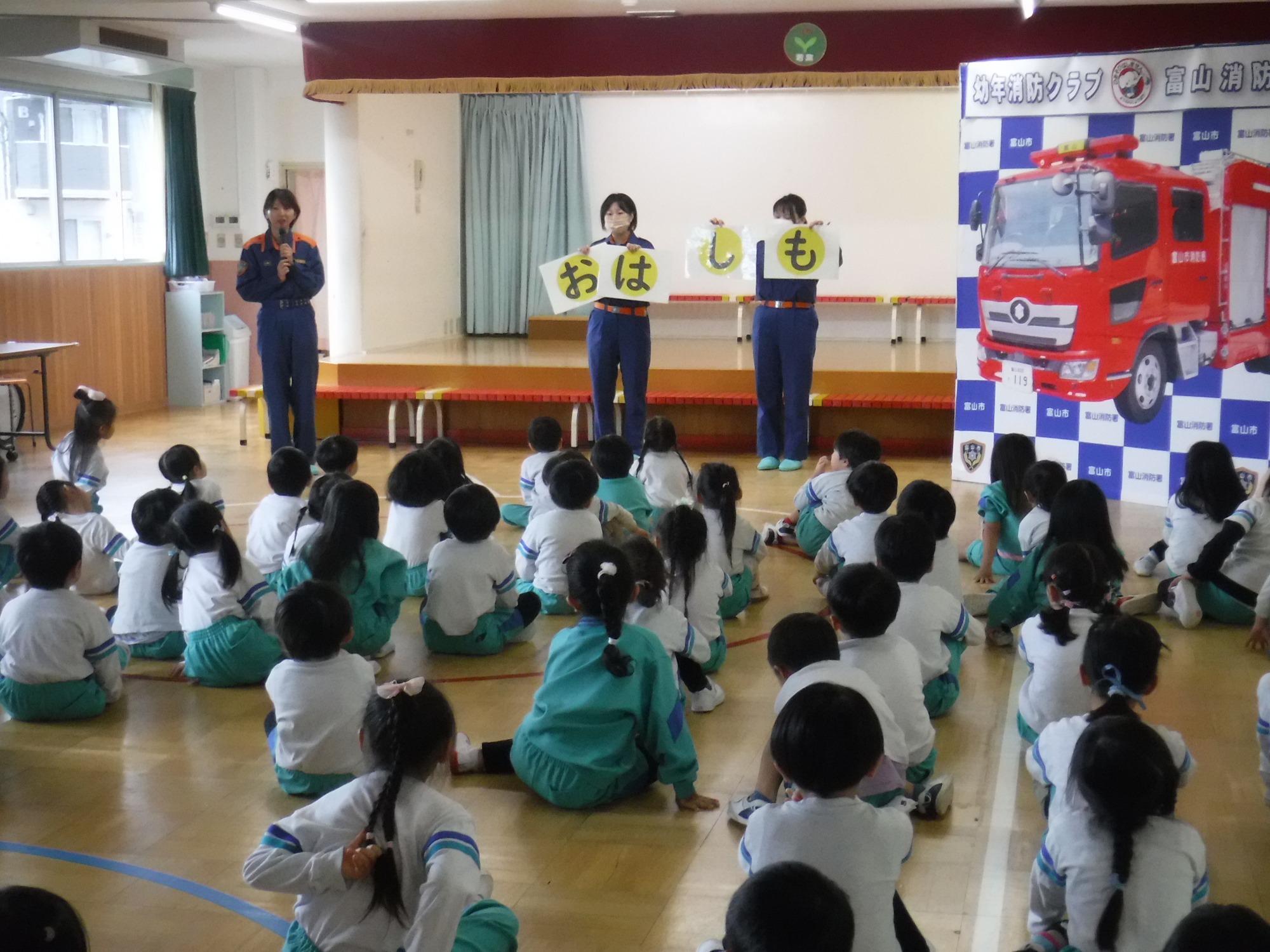 消防署の方が来られ、紙芝居やカードを使って『火』の危険性について教えてくださいました。
