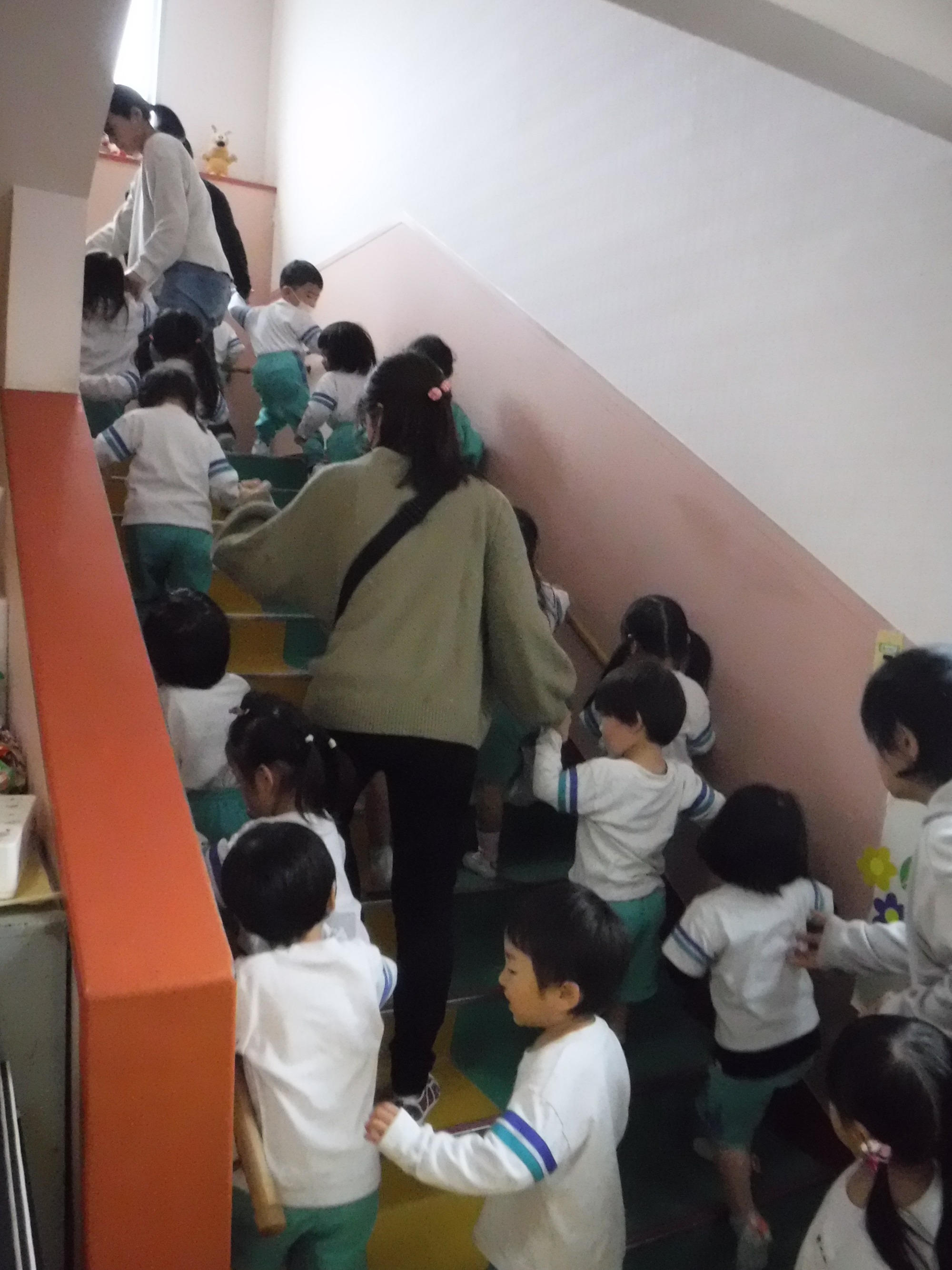今回は園舎裏の駐車場まで避難する訓練を行いました。みんなすばやく安全に移動することができました。