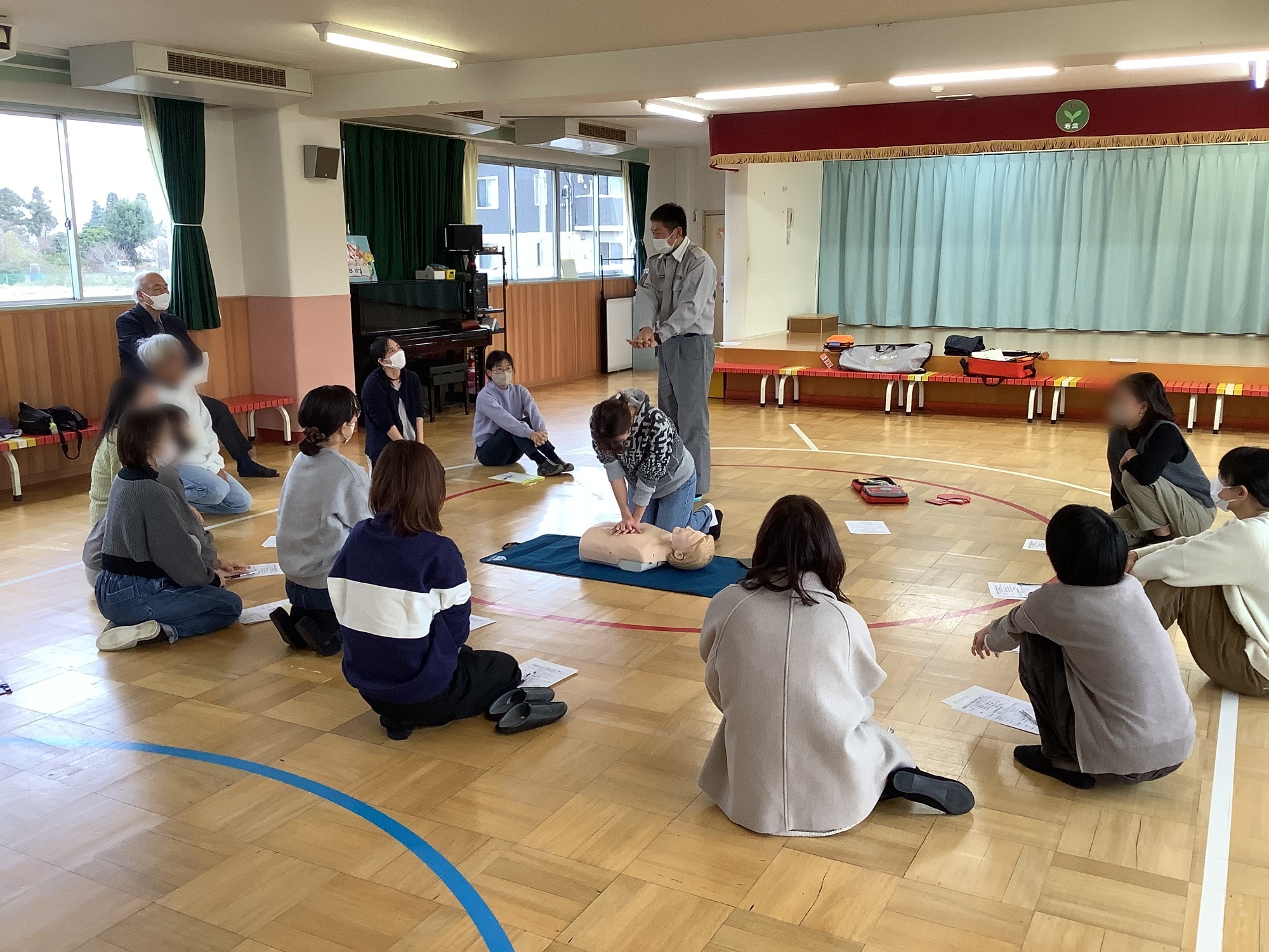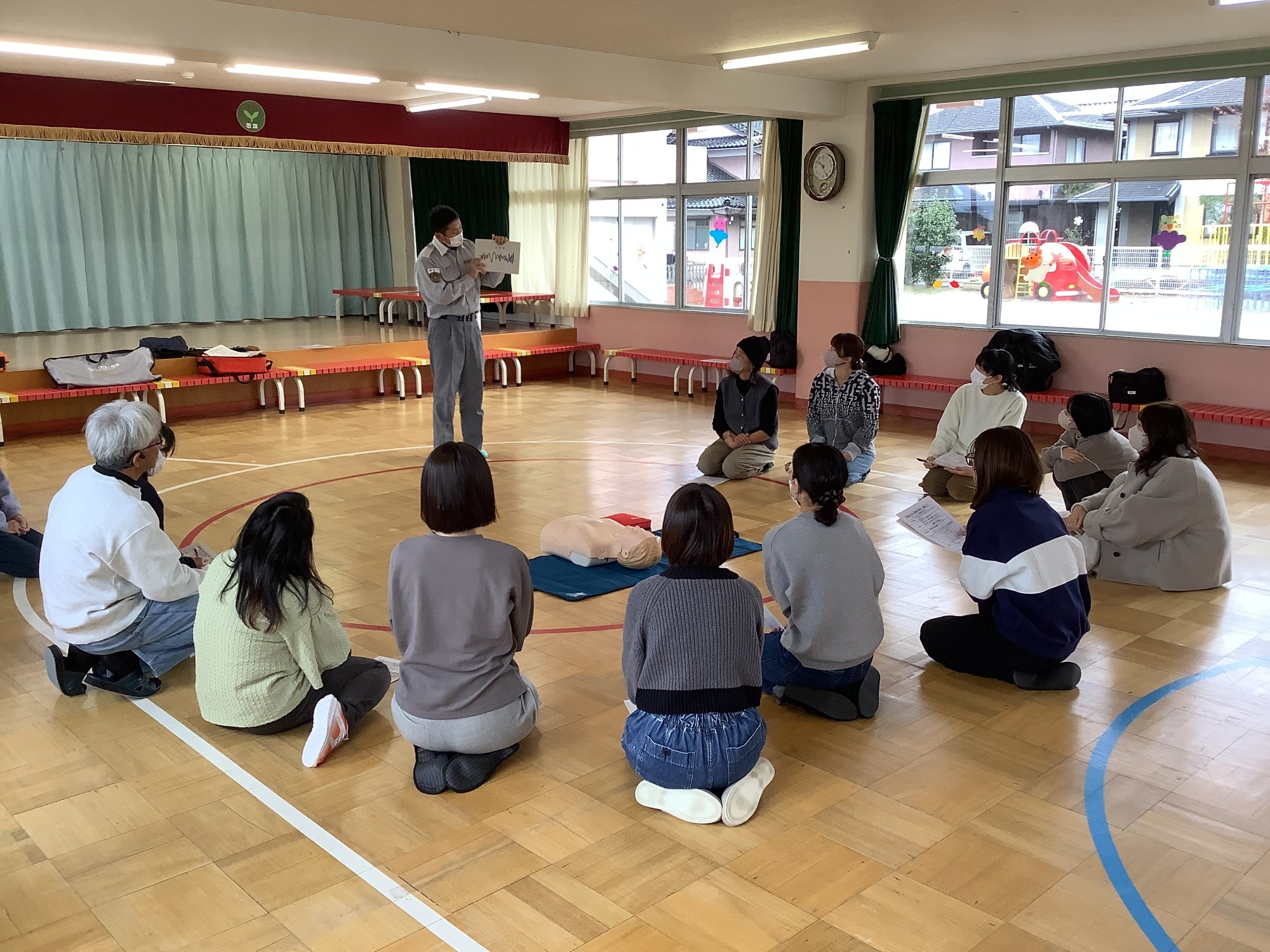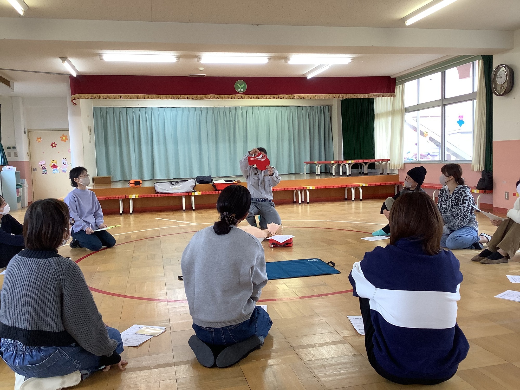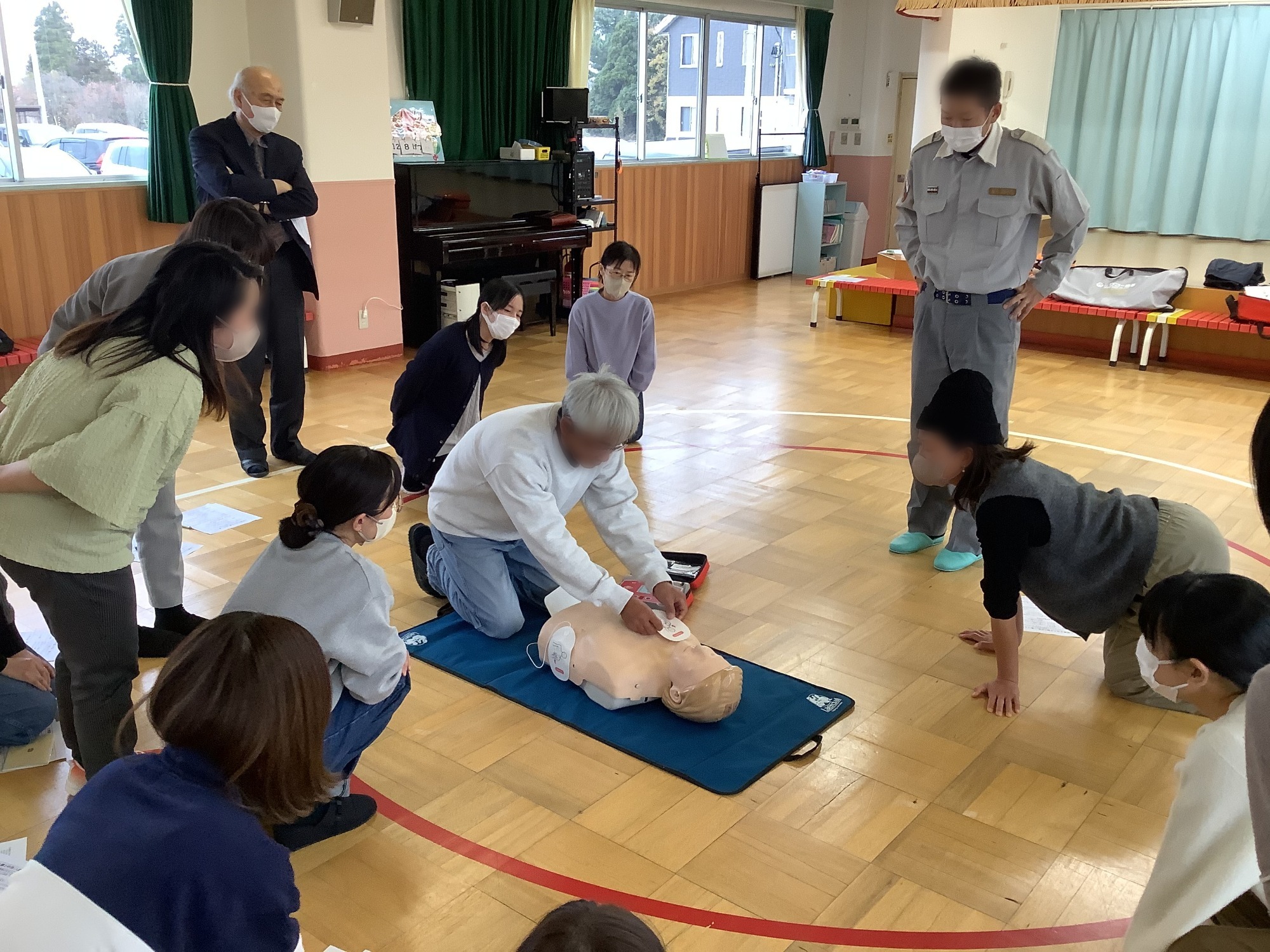 消防署の救命救急士の方に来ていただいて、保護者向けの救命講習を開き、心肺蘇生法の手順やAEDの使用法を教えていただきました。