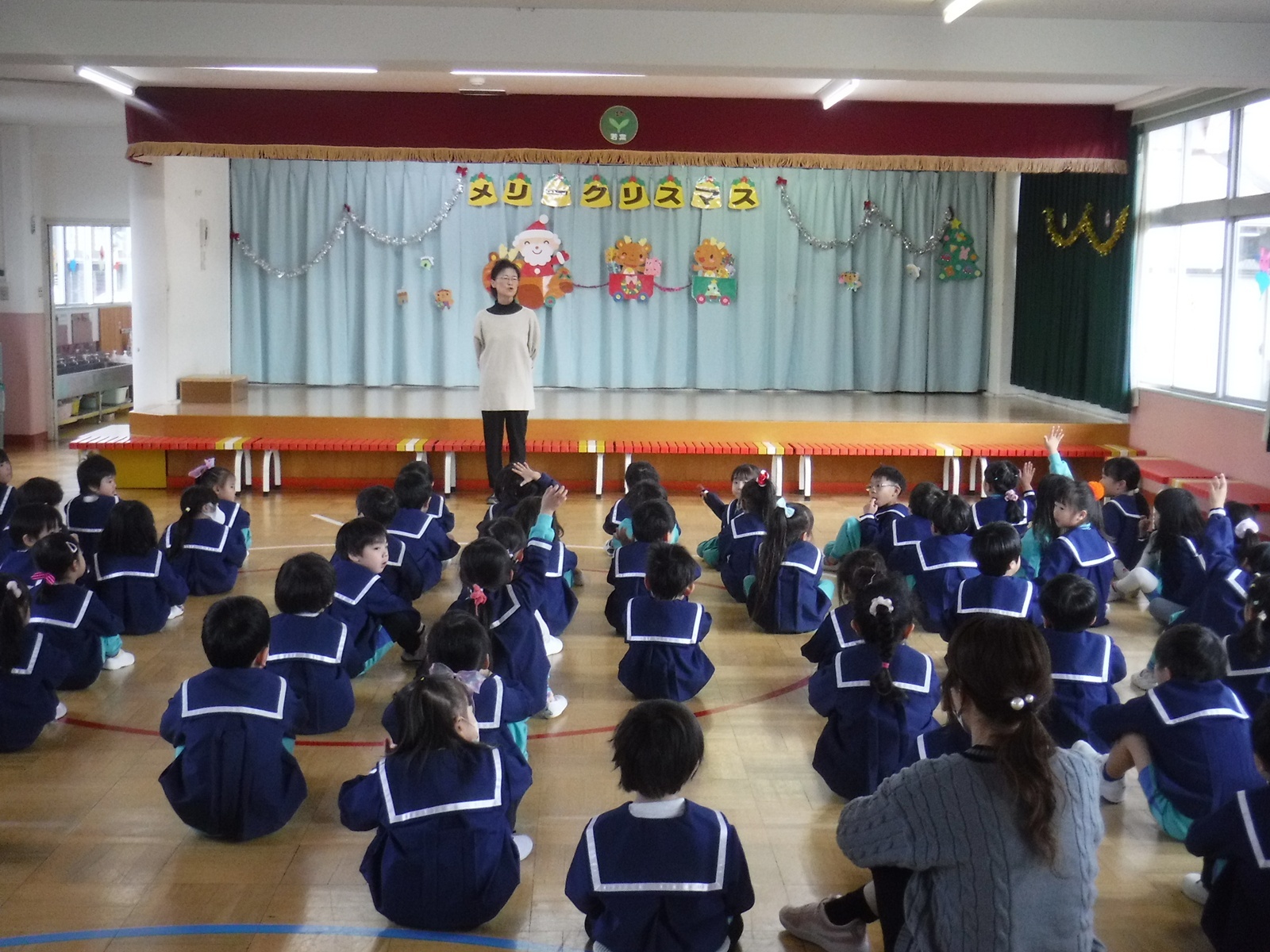 2学期最後の終業式。園長先生が「今年楽しかったことはなんですか?」と子供たちに聞くとたくさん手が上がり、何人かにインタビュー!来年も楽しいことがたくさんあるといいですね