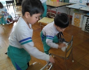 保育室に戻ると、みんなで大掃除!遊んだおもちゃや机をきれいにしてピッカピカ☆気持ちよく新年を迎えられそうです