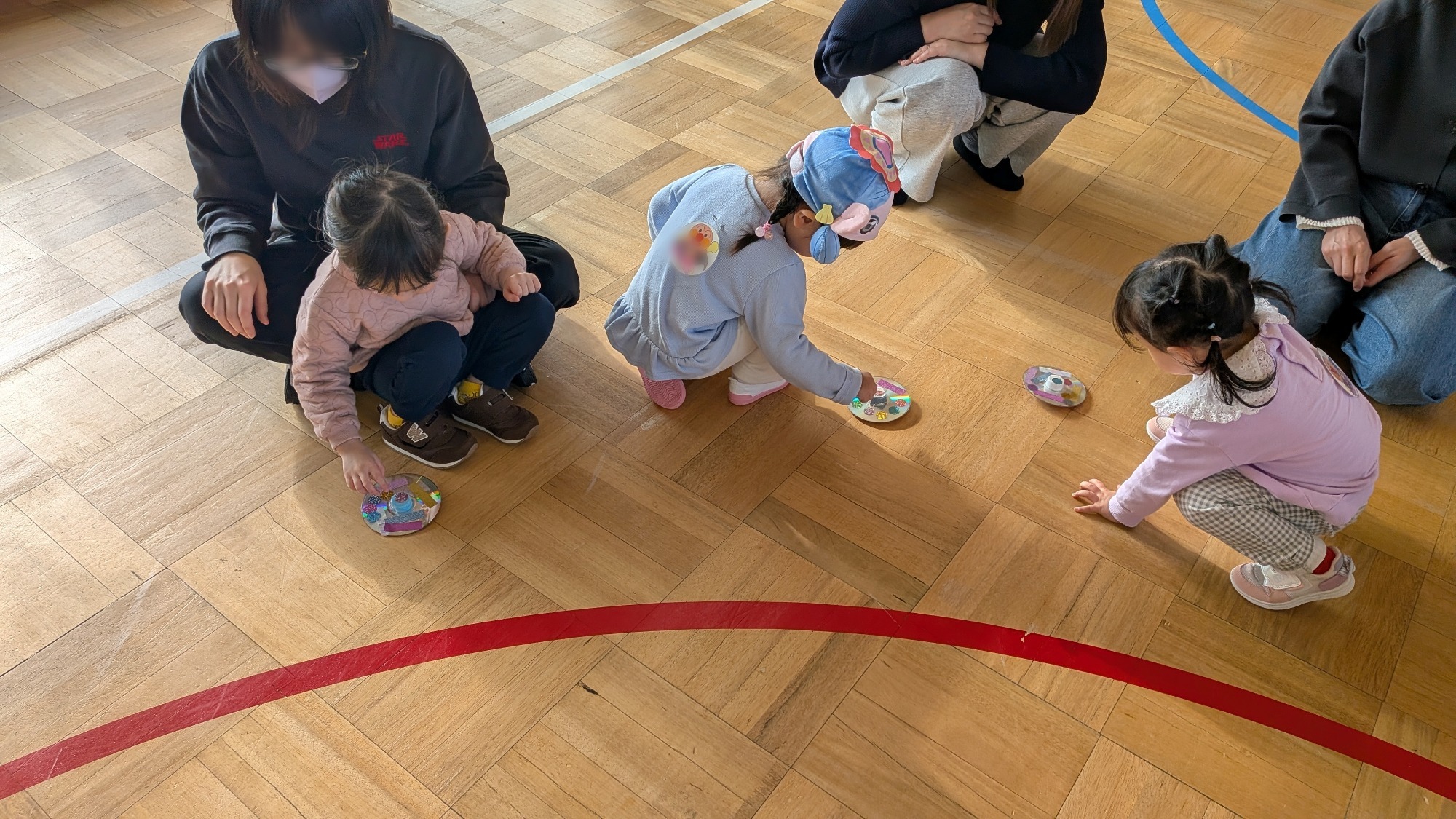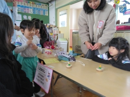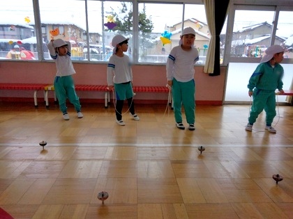 ゆり組は遊戯室でこま回し会を行い、掛け声に合わせてこまを投げ、誰が一番長く回るか競いました。今年の1位は何秒まわり続けたのかな!?