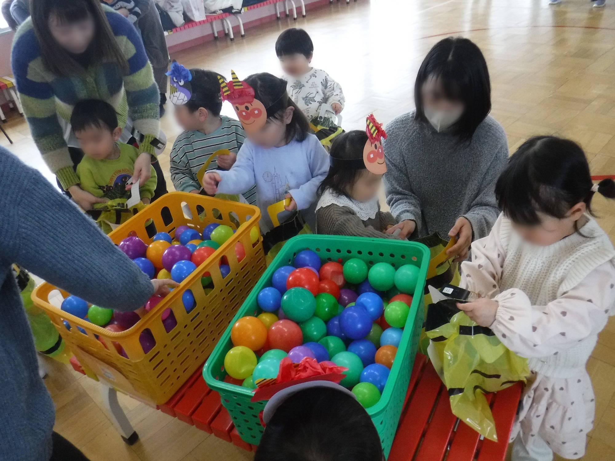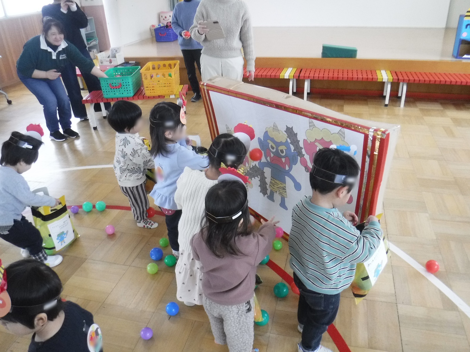 うさちゃんクラブは、ちょっと早めの豆まき。オニのお面を作って鬼のパンツ型のかばんにたくさんの豆(ボール)をつめて、鬼退治に出発だ~!